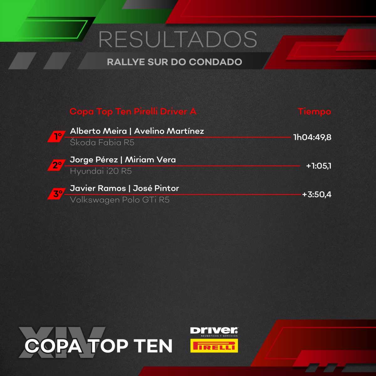 La Copa Top Ten Pirelli Driver «A» y Supercampeonato Gallego R5 volvió a tener un claro dominador en la figura del equipo formado por Alberto Meira y Avelino Martínez, que con puño de hierro dominaron la jornada y lograban la quinta victoria de cinco posibles, tras la cual podrían proclamarse campeones en la próxima prueba, el Rallye Pazo Tizón, si terminan en cuarta posición independientemente de lo que hagan sus rivales. Asentado en la segunda posición, Jorge Pérez tuvo un positivo estreno de su Hyundai i20 R5, logrando ambos scratch en el tramo de casa, Salceda. Javier Ramos firmaba la tercera plaza después de sufrir alguna que otra avería en su Volkswagen Polo.