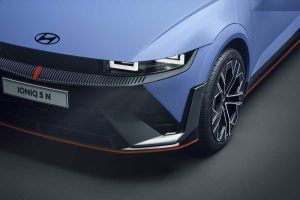 En la parte delantera, se mejora la aerodinámica incorporando un lip anexo al parachoques delantero. El «Naranja Luminoso» exclusivo para los vehículos eléctricos N en la parte inferior de la cubierta negra del parachoques delantero continúa a lo largo de los faldones laterales, dando al IONIQ 5 N un aspecto de coche de carreras. Esta impresión se refuerza aún más con las llantas de aluminio forjado de 21 pulgadas que están envueltas en neumáticos de alto agarre 275/35R21 Pirelli P-Zero para mejorar la conducción y el agarre en circuito.