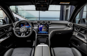 El sistema de infoentretenimiento MBUX incluye varias pantallas y funciones específicas de AMG. Entre ellos se incluyen pantallas especiales en el cuadro de instrumentos, en la pantalla central multimedia con orientación vertical de la consola central y en el Head-up Display opcional. El modo «Supersport» exclusivo de AMG ofrece la posibilidad de mostrar diversos contenidos a través de una estructura vertical. Esto incluye un menú de configuración que muestra los ajustes actuales del tren de rodaje o la transmisión. Además, el conductor puede visualizar un mapa de navegación o datos de consumo con el estilo «Supersport».