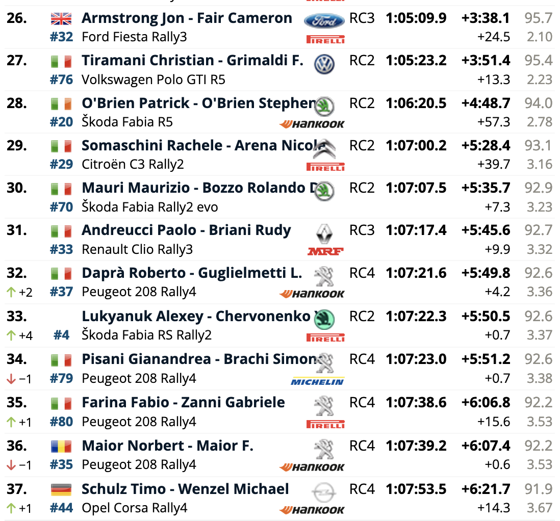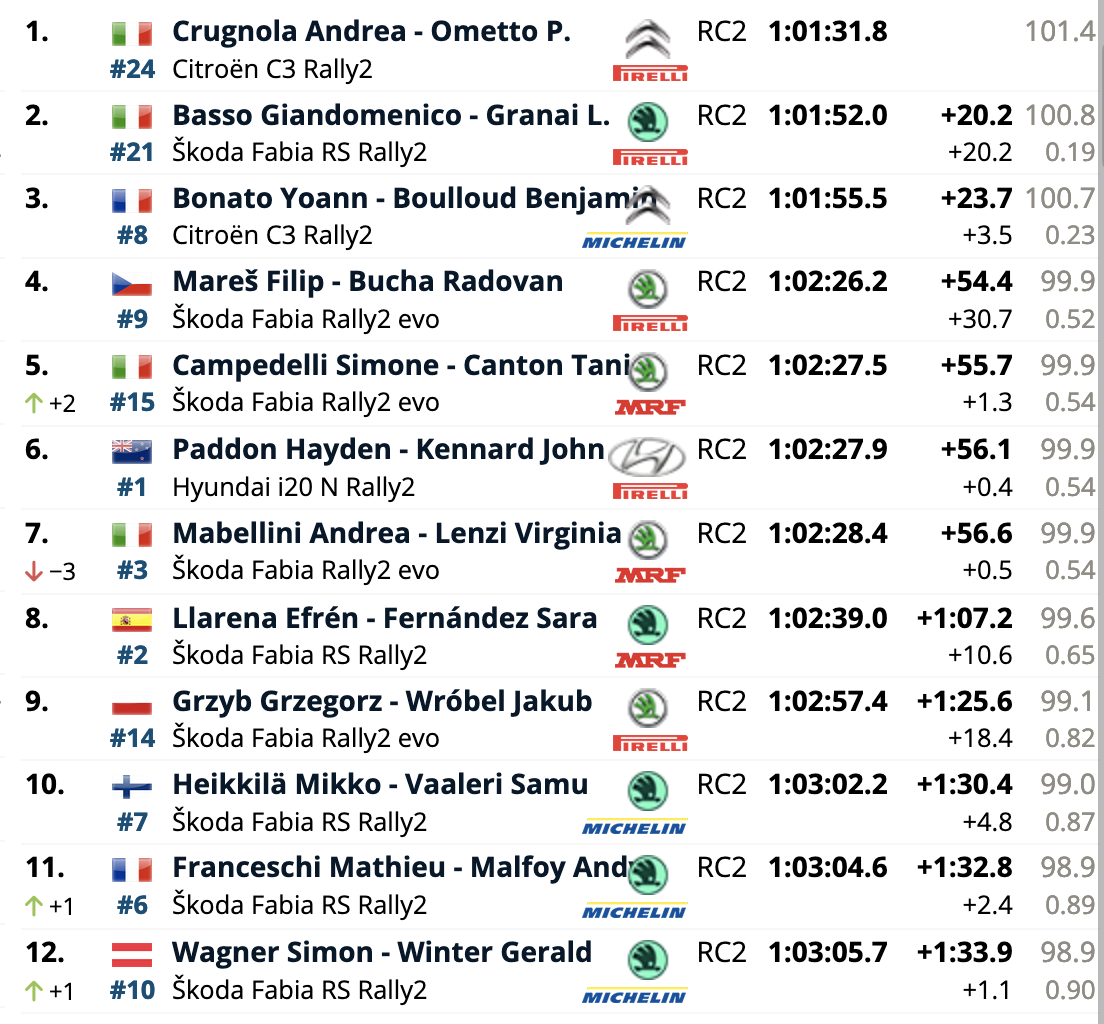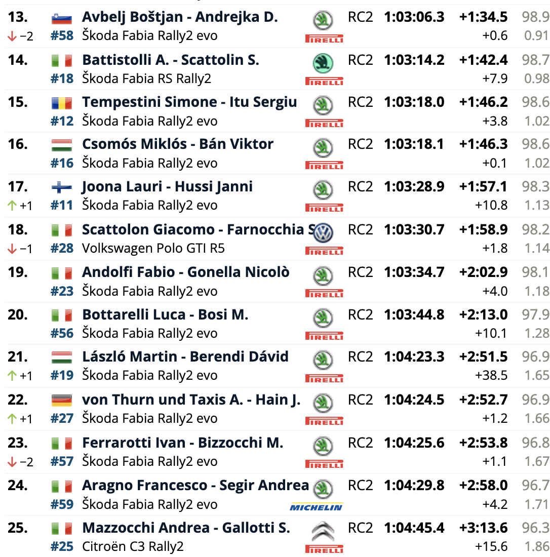 El campeón europeo defensor del título, el español Efrén Llarena, está un lugar detrás de Mabellini en octavo lugar, con Grzegorz Grzyb en noveno y Mikko Heikkilä en décimo. Al igual que el undécimo clasificado, Mathieu Franceschi, el campeón finlandés Heikkilä se subió al Fabia de última generación de Škoda para debutar con esa unidad en el Rally di Roma Capitale.