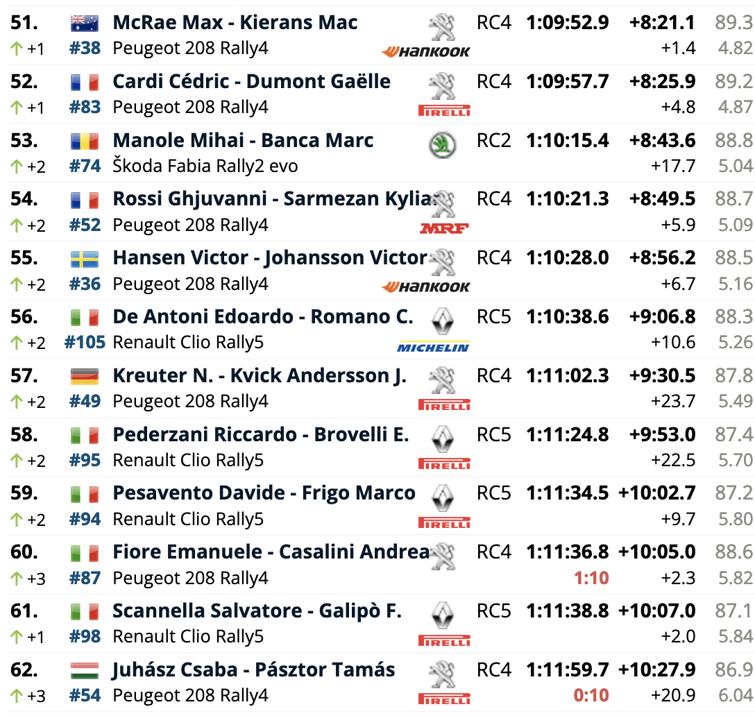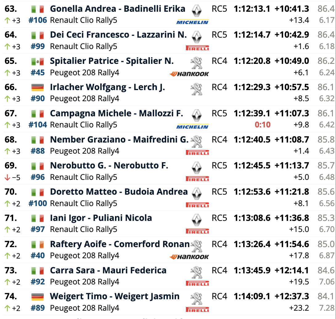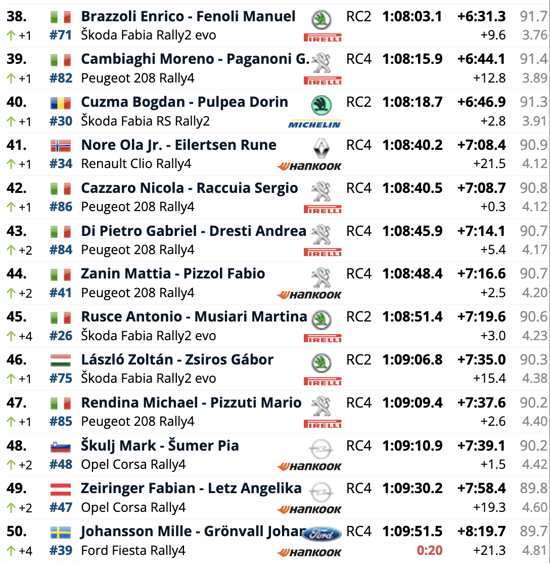 El campeón europeo defensor del título, el español Efrén Llarena, está un lugar detrás de Mabellini en octavo lugar, con Grzegorz Grzyb en noveno y Mikko Heikkilä en décimo. Al igual que el undécimo clasificado, Mathieu Franceschi, el campeón finlandés Heikkilä se subió al Fabia de última generación de Škoda para debutar con esa unidad en el Rally di Roma Capitale.