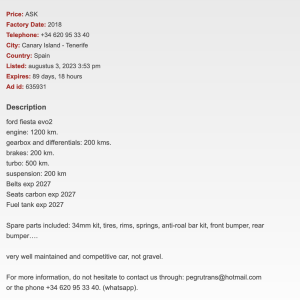 El piloto tinerfeño Javier Afonso ha puesto a la venta en la página especializada www.rallycarsforsale.net el Ford Fiesta R5 MK1 Evo2 chasis 237 con el que ha venido compitiendo las últimas temporadas.