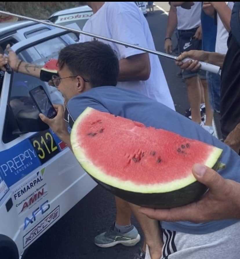 Se ha convertido en una tradición y es algo maravilloso y en pocos sitios visto. Un grupo de aficionados obsequian a los pilotos que cada año compiten en la Subida a Barlovento con su preciado trozo de sandía. ¿Que nunca se pierda esta preciosa tradición!