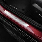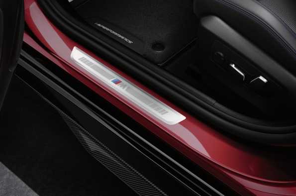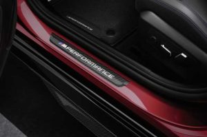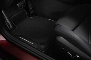 Tan pronto como abre las puertas, las placas de los umbrales de las puertas M Performance Carbon hacen una declaración sorprendente y muestran inequívocamente que la nueva berlina ejectutiva está orientada hacia el rendimiento dinámico. Además, los tapetes de terciopelo M Performance con su borde de cuero sintético y costuras decorativas en colores contrastantes también añaden un toque deportivo al espacio para los pies. Los dos tapetes delanteros del juego de cuatro piezas también cuentan con la inscripción M Performance bordada en la inserción de tela y una bandera con los colores característicos de M. Los tapetes de terciopelo combinan perfectamente con la gama de productos M Performance existente y completan la apariencia de alta calidad.