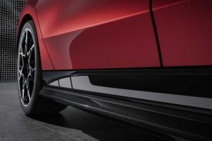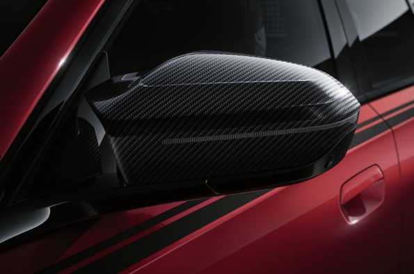 Todos los componentes de carbono están hechos de polímero reforzado con fibra de carbono (CFRP), sellados con laca transparente para lograr un acabado de alta calidad y ofrecen un aspecto nítido y deportivo desde todos los ángulos. En la parte delantera y trasera de la carrocería, el accesorio delantero M Performance Carbon, así como el alerón trasero M Performance Carbon Pro y el difusor trasero M Performance hecho de fibra garantizan una apariencia distintiva. Un alerón trasero M Performance imprimado también está disponible como opción.