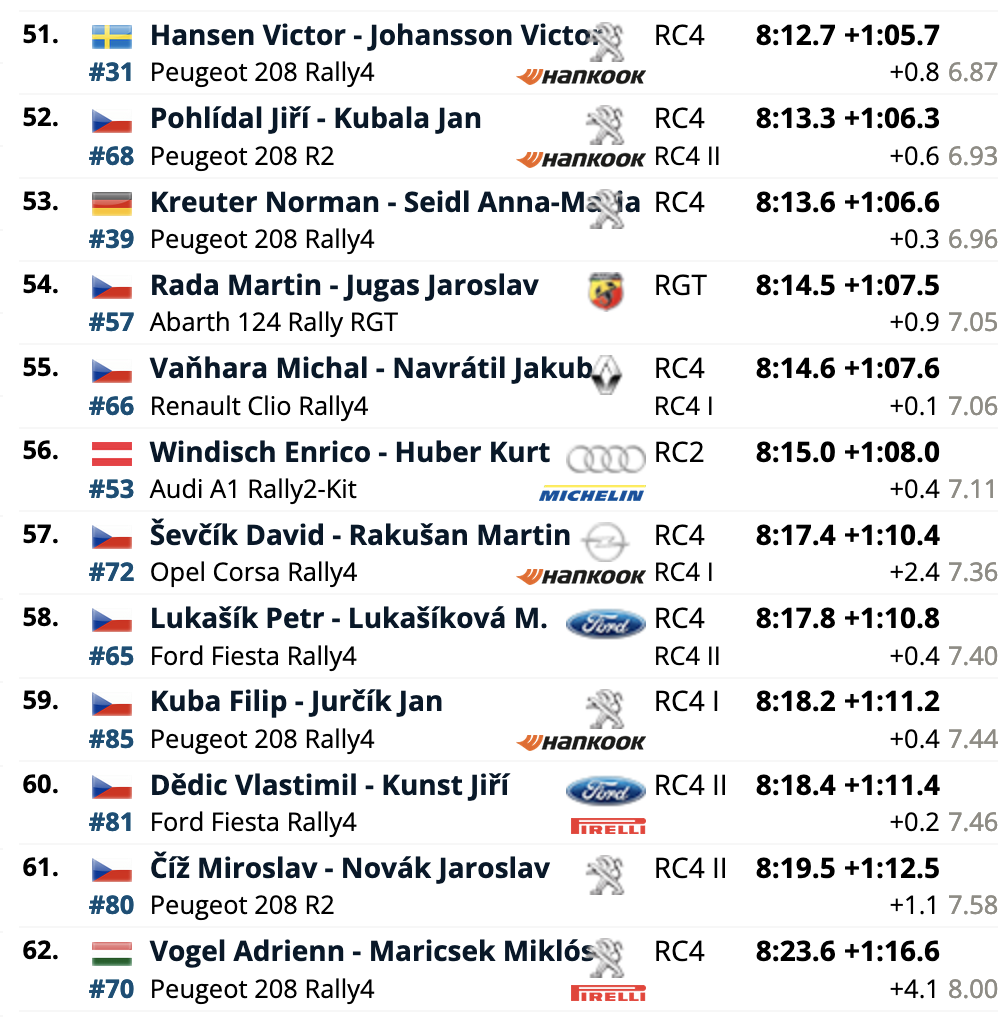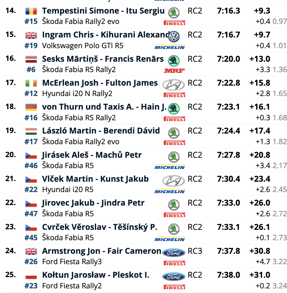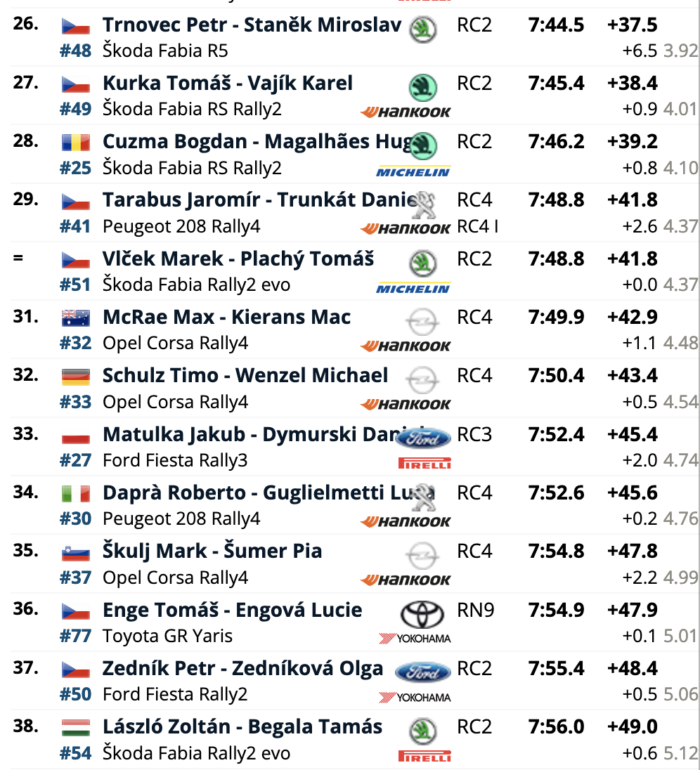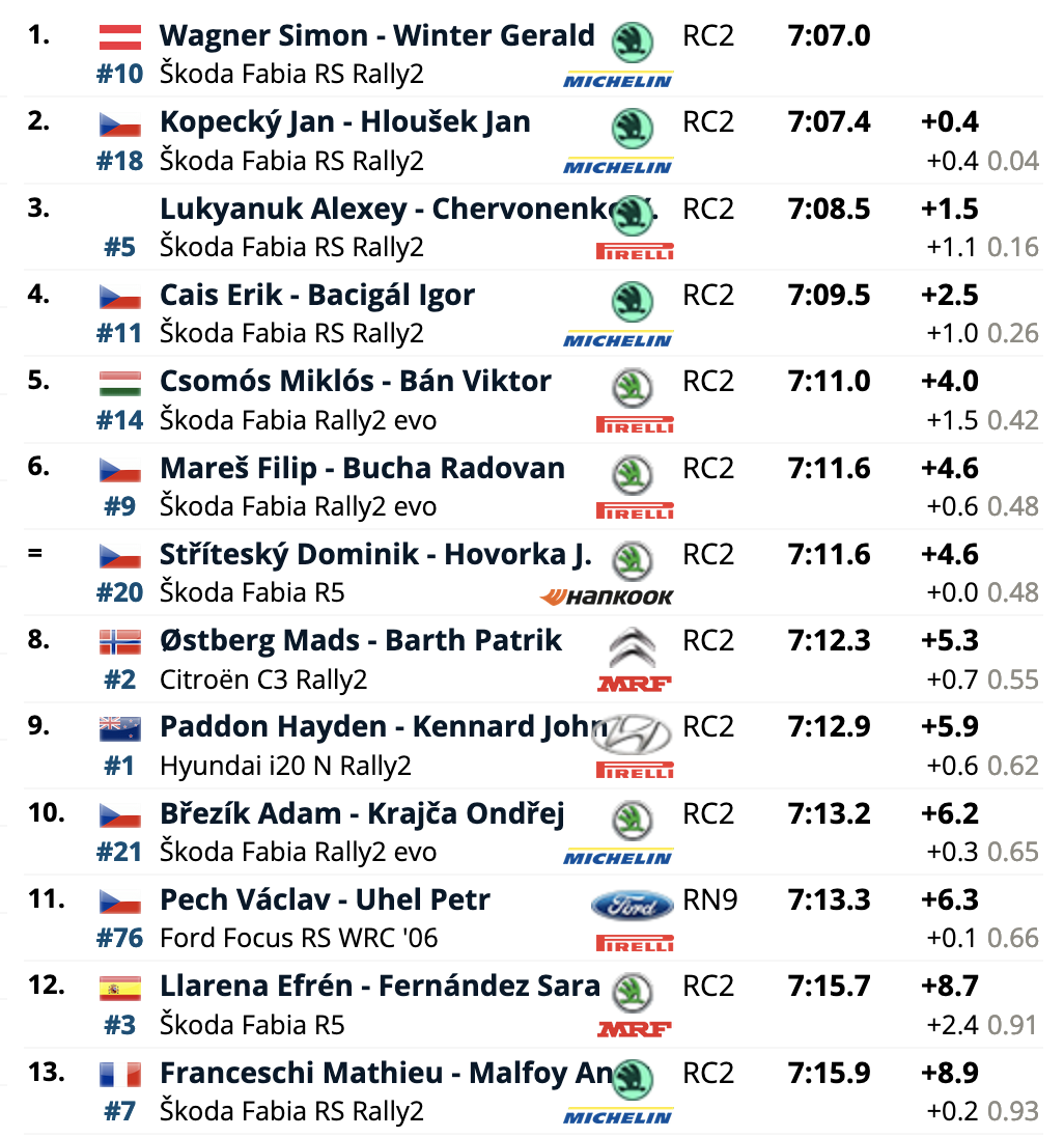 El cuarto puesto es para los también locales Erik Cais e Igor Bacigál, con otro Škoda Fabia RS Rally2, siendo los siete primeros clasificados pilotos con la montura checa. El primer equipo no Skoda es el compuesto por Mads Østberg y Patrik Barth (Citroën C3 Rally2), octavos a 5,2 del liderato, seguidores de los líderes del certamen, Hayden Paddon y John Kennard (Hyundai i20 N Rally2), novenos.