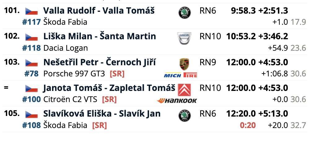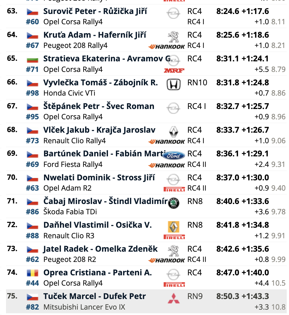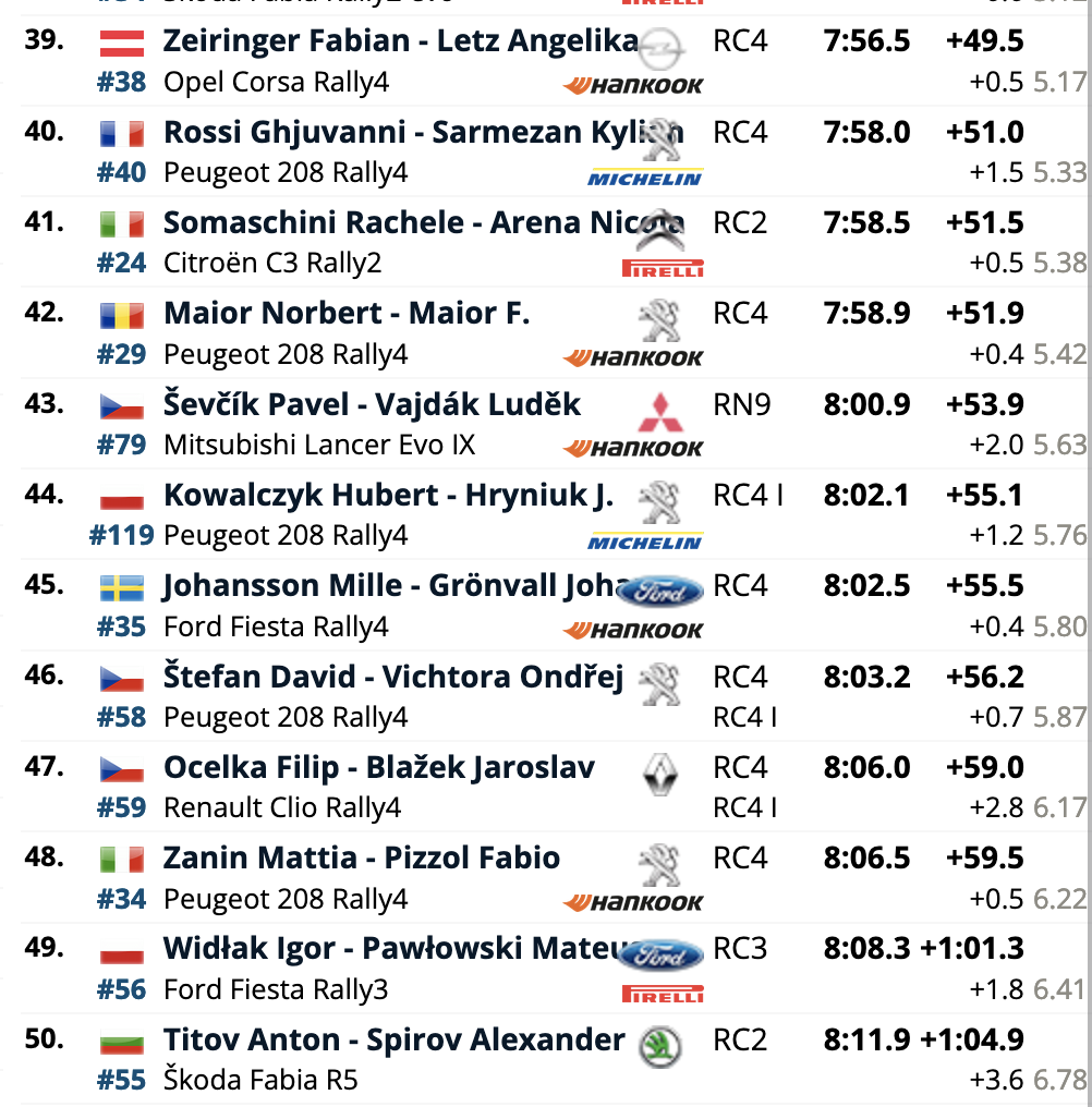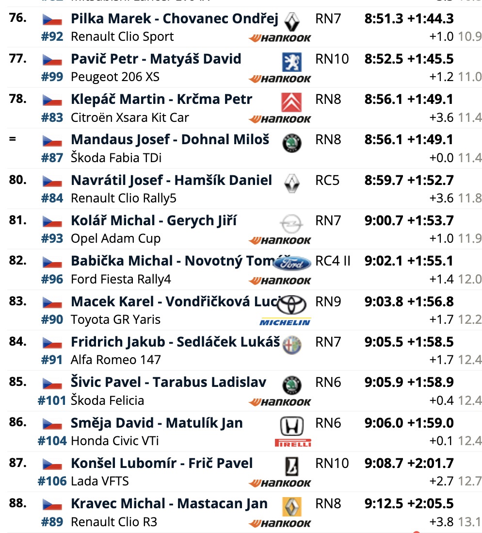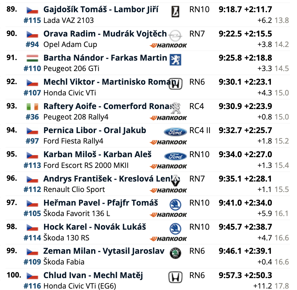 El cuarto puesto es para los también locales Erik Cais e Igor Bacigál, con otro Škoda Fabia RS Rally2, siendo los siete primeros clasificados pilotos con la montura checa. El primer equipo no Skoda es el compuesto por Mads Østberg y Patrik Barth (Citroën C3 Rally2), octavos a 5,2 del liderato, seguidores de los líderes del certamen, Hayden Paddon y John Kennard (Hyundai i20 N Rally2), novenos.