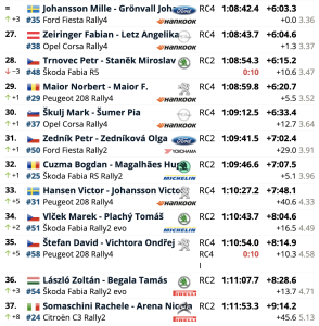 Los primeros líderes, Wagner y Winter ocupan el último escalón del podio a 28.7, siendo cuartos de la general los locales Adam Březík yOndřej Krajča (Škoda Fabia Rally2 evo), que se sitúan a 41.2 de los primeros y a 12.5 de los terceros, pero teniendo tras sus talones a los líderes del Campeonato de Europa de Rallys 2023, Hayden Paddon y John Kennard (Hyundai i20 N Rally2), que están a sólo 1.6 en la quinta plaza.