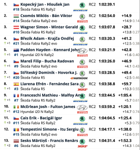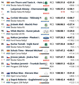 Los primeros líderes, Wagner y Winter ocupan el último escalón del podio a 28.7, siendo cuartos de la general los locales Adam Březík yOndřej Krajča (Škoda Fabia Rally2 evo), que se sitúan a 41.2 de los primeros y a 12.5 de los terceros, pero teniendo tras sus talones a los líderes del Campeonato de Europa de Rallys 2023, Hayden Paddon y John Kennard (Hyundai i20 N Rally2), que están a sólo 1.6 en la quinta plaza.