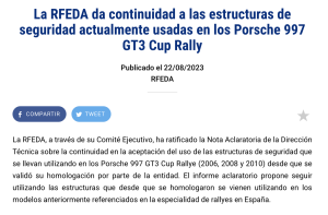 La Real Federación Español a de automovilismo (RFEDA) da continuidad a las estructuras de seguridad actualmente usadas en los Porsche 997 GT3 Cup Rally.