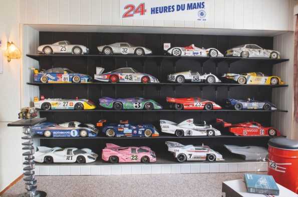 La flota de coches a escala 1:5 que atesora es impresionante. El Porsche más antiguo que ha creado es un 550/1500 (RS Coupé de 1956) que compitió en Le Mans con el número 25 y consiguió cruzar la meta en quinta posición. También pintado en plata brillante figura el Porsche 904/6 número 32, en el que Herbert Linge y Peter Nöcker obtuvieron el cuarto lugar en el mismo circuito. Le siguen el Carrera 906 que terminó séptimo en Le Mans en 1966 con el número 58, el 908/02 cola larga de 1970 que portaba el número 27 y terminó tercero en la carrera de La Sarthe, y el mundialmente famoso coche cámara, un 908/02 de color azul que llevaba el número 29. Este último se utilizó para grabar escenas en la película Le Mans, protagonizada por Steve McQueen. Este modelo a escala 1:5 es el más detallado, contiene más de 1.600 piezas e incluso un capó motor en la parte trasera que se puede quitar.