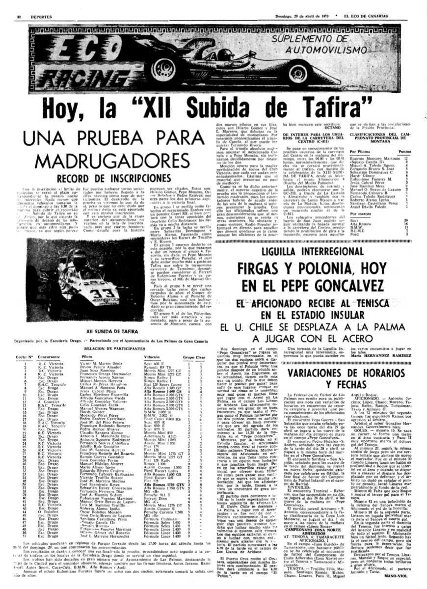 En este 2023 conmemoramos los 50 años de aquella última edición de la “XII Subida a Tafira” celebrada el domingo 29 de abril de 1973, donde se alcanzó un récord de participantes y de asistencia de público y además fue organizada por la Escudería Drago y Patrocinada por el Ayuntamiento de Las Palmas.