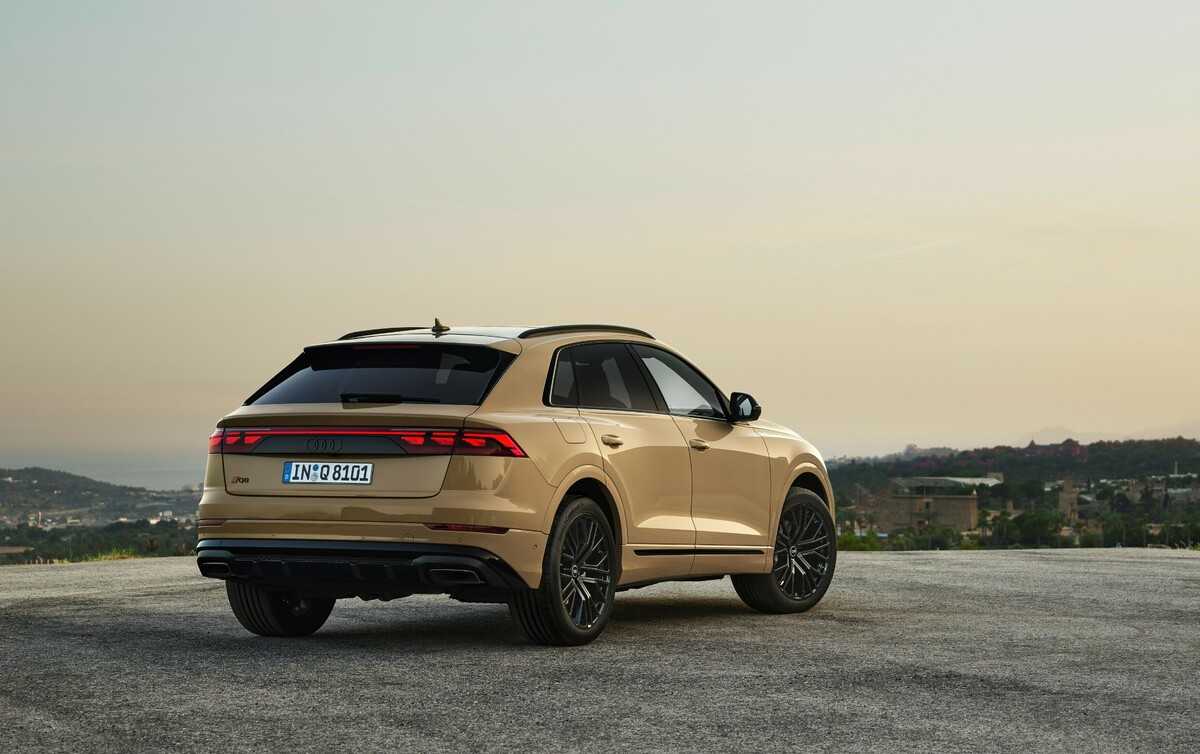 El Audi Q8 luce la nueva y moderna identidad corporativa de Audi, con los aros bidimensionales que debutaron en el Q8 e-tron, que impresionan visualmente por su mayor precisión. En lugar de cromados, el nuevo logo con los cuatro aros está acabado en colores blanco y negro; como parte del paquete de óptica negro plus, el blanco se sustituye por un gris oscuro que sigue pareciendo negro brillante. En el Q8 el pilar B lleva ahora también el identificador del modelo, el derivado y la tecnología.