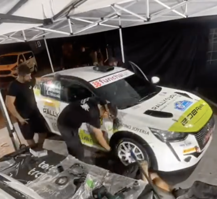 Así fue la noche del viernes en este rally donde teníamos que cambiar el kit de tierra a asfalto. Apenas 50 minutos bastaron a nuestros mecánicos para tener el coche listo para la 2ª etapa.