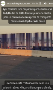 Según informa TerraTraining Motorsport, desde la naviera se está buscando la opción de transportar el coche vía aera para que pueda estar en la salida del Rally teldense. Toda una odisea… Esperemos que el final sea feliz. Tiempo hay…