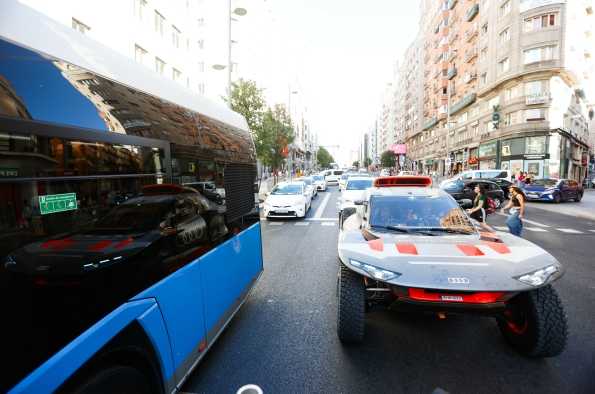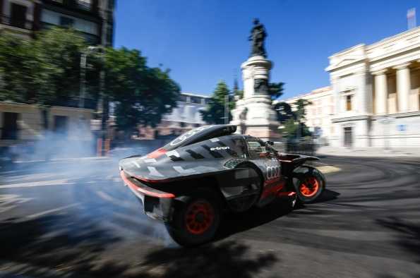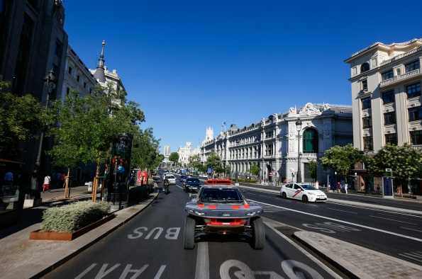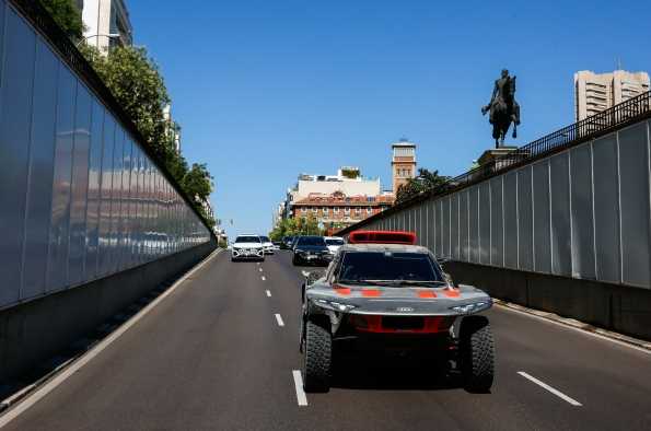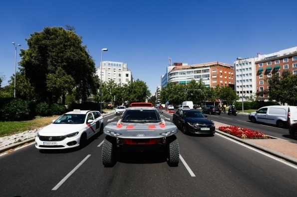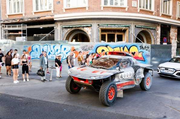 El recorrido comenzó en la Plaza de Toros de Las Ventas, inaugurada hace más de 90 años. Desde sus galerías subterráneas, Carlos Sainz y Lucas Cruz se adentraron en el interior del ruedo, donde el RS Q e-tron realizó una espectacular exhibición de drift demostrando la potencia de su sistema de propulsión eléctrico, que genera 263 kW (358 CV). Finalizado el espectáculo en Las Ventas, comenzó el paseo por las calles de Madrid. El RS Q e-tron pasó por la Puerta de Alcalá hasta llegar a la Fuente de Cibeles. Los pilotos se bajaron del coche para tomarse una foto como dos turistas más en la famosa fuente, rodeada por el Palacio de Buenavista, el Palacio de Linares y el Palacio de Cibeles. El siguiente punto del recorrido escogido como uno de los lugares destacados de Madrid fue la Fuente de Neptuno, donde el Audi RS Q e-tron deleitó al público con una serie de derrapes al típico estilo de los rallies. Desde allí, Sainz y Cruz condujeron por la Gran Vía, adentrándose en la zona de Madrid libre de emisiones gracias al sistema electrificado del coche con el que compiten en el Rally Dakar.