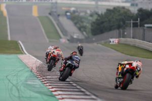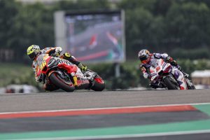 Su compañero en el equipo Repsol Honda, Marc Márquez, ha vuelto a ilusionar a los aficionados con un gran inicio. Como en la carrera al sprint del sábado, Márquez se ha situado cuarto antes de completar el primer giro hasta que, tras el sexto paso por meta y cuando rodaba tras la estela de Pecco Bagnaia, ha perdido la adherencia del neumático delantero en la curva uno y se ha caído. Se ha mantenido en carrera y ha remontado desde la decimosexta posición hasta la novena en la que ha pasado bajo la bandera de cuadros.