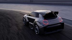 Al igual que el frontal, cada uno de los pilotos traseros consta de un fino led semicircular superior e inferior que contrasta con las formas cuadradas de la parte inferior, definida por formas ferozmente funcionales para gestionar el flujo de aire y maximizar la generación de carga aerodinámica a medida que el aire escapa por debajo del coche. La anchura total del coche se acentúa con una barra horizontal debajo de lo que parece una suave sonrisa que define el contorno del portón trasero.