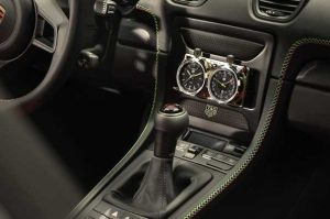 Pero, sin duda, el elemento al que se dirige la mirada nada más acceder al habitáculo de este 718 GT4 RS es el módulo de cronómetro situado en la consola central. Este componente ha sido diseñado y fabricado por TAG Heuer específicamente para el proyecto y no se comercializa. El reloj izquierdo, que muestra la hora, tiene el diseño típico de los modelos Carrera y cuenta con una reserva de marcha de ocho días. A su lado, un cronómetro ayuda al conductor a mantener la velocidad media prescrita en los rallyes.