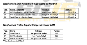 Santi García y Néstor Casal completaron el Actronics Rallye Tierra de Madrid celebrado este fin de semana, y donde subieron con el Peugeot 208 Rally4 mantenido por Mavisa Sport a la tercera plaza del podio, un resultado que le sirve a la dupla gallega para seguir en la primera plaza del certamen nacional de tierra dedicado a los vehículos de dos ruedas motrices a falta de dos citas.