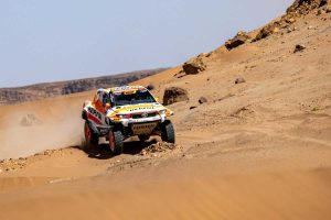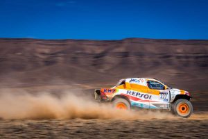 Esteve también ha destacado que el Toyota Hilux T1+ del Repsol Toyota Rally Team funciona todavía mejor después de un cambio de reglaje que llevaron a cabo en la jornada anterior. «El coche ha funcionado a la perfección«, confirma Isidre, en una especial que tenía un poco de todo. «Al principio, mucho polvo, fesh-fesh y piedras, luego zonas arenosas, una parte de dunas y una pista muy rápida al final», detalla el piloto.