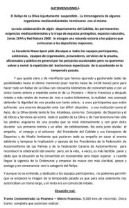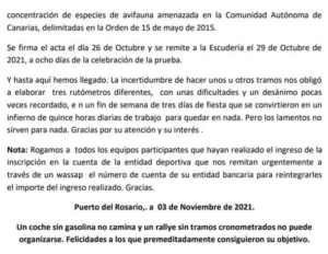 Publicamos el escrito donde se demuestra, no sólo la nula predisposición de los nuevos responsables del Cabildo de Fuerteventura, sino las zancadillas y piedras que ponen en el camino a los organizadores para que no sólo se suspendiera el Rally de La Oliva, sino para que otras pruebas que se disputen en la isla corran el mismo resultado y se terminen aplazándose o suspendiéndose.