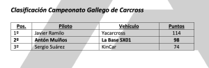 lluvias, que impidieron la celebración de la final Antón Muíños clausuró su temporada en el Campeonato Gallego de Autocross en el circuito municipal de Carballo donde las condiciones climatológicas fueron clave en el devenir de la prueba, y es que el piloto de La Base Motorclub no consiguió marcar un buen crono en la tanda de calificación, lo que le obligó a remontar desde el fondo de la parrilla en las dos mangas clasificatorias, que a la postre fueron clave para la clasificación final de la cita, ya que la lluvia apareció de forma torrencial durante el mediodía para acabar suspendiendo las finales.