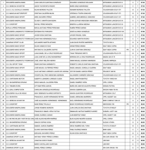 – Juan Carlos Quintana (Mitsubishi Evo X) y Jesús Tacoronte (Mitsubishi Evo IX) encabezan la lista, seguidos en el orden por Kilian Moreno, Cristian Calderín y Ariel Navarro con sus Golf de 2RM. Y más pilotos Evo´s como Borja Pérez, Esteban Feo, Javier Sosa, Feluco Pérez…