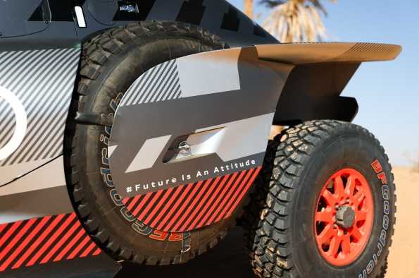 El Audi RS Q e-tron es un vehículo de carreras muy fiable incluso en las condiciones más exigentes: los tres coches alcanzaron la línea de meta en su primera participación en el Rally Dakar en 2022. El hecho de que dos de los tres prototipos no terminaran en 2023 no se debió a problemas técnicos, sino a diversos accidentes. Como la fiabilidad del innovador sistema de propulsión está más que probada, Audi Sport puede concentrarse en los detalles. Anteriormente las piedras podían quedar atrapadas entre la llanta, el disco de freno y las manguetas, y en algunos casos causaban daños considerables, obligando a cambiar las ruedas en más de una ocasión, con la consecuente pérdida de tiempo. Los nuevos elementos de anclaje dejan más espacio para que las piedras salgan despedidas con mayor facilidad. Al mismo tiempo Audi Sport utiliza a partir de ahora llantas más resistentes. Y unos flancos más fuertes también hacen que la nueva generación de neumáticos, del proveedor BF Goodrich, sea menos vulnerable.