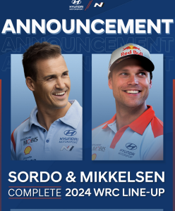 El piloto español Dani Sordo y el noruego Andreas Mikkelsen compartirán uno de los Hyundai i20 N Rally1 oficiales en el Campeonato del Mundo de Rallys (WRC) en la temporada 2024.