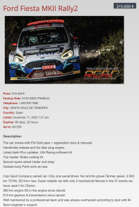 El Ford Fiesta MKII Rally2 del equipo tinerfeño Copi Sport, con el que han competíos las últimas temporadas Enrique Cruz y Yeray Mujica, está la venta en la popular web de venta de coches de competición rallycarsforsale.net. El precio es de 215.000 euros