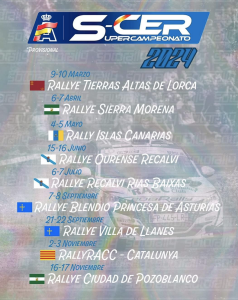 La Real Federación Española de Automovilismo ha publicado los calendarios de la temporada 2024 del SúperCampeonato de España de Rallys (SCER), Copa de España de Rallyes de Tierra (CERT) y Copa de España de Rallys de Asfalto (CERA)