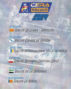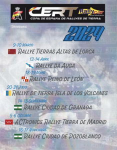 La Real Federación Española de Automovilismo ha publicado los calendarios de la temporada 2024 del SúperCampeonato de España de Rallys (SCER), Copa de España de Rallyes de Tierra (CERT) y Copa de España de Rallys de Asfalto (CERA)