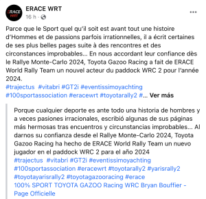 “Es un gran placer estar en la salida de Montecarlo 2024. Será una única carrera con este nuevo Toyota Yaris, dirigido por el equipo ERACE WRT, formado por profesionales y amigos del automovilismo de los que he sido podido colaborar en el pasado”, declaró el francés.