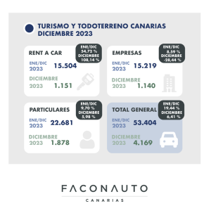· Es la cifra total de unidades matriculadas a lo largo de 2023, incluyendo turismos y todoterrenos, vehículos comerciales, industriales, guaguas, motos y ciclomotores. Respecto al mes de diciembre, el mercado total de turismos y todoterrenos, crece un 6,41% con respecto a diciembre de 2022 con 4.169 vehículos matriculados.