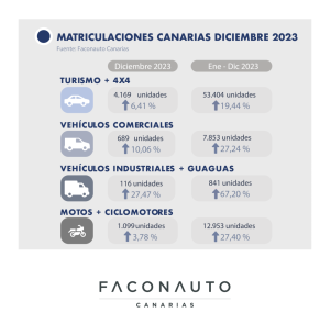 Durante todo el 2023, se han matriculado 53.404 turismos, un 19,44% más que en 2022; 7.853 vehículos comerciales, un 27,24% más que en 2022; 841 vehículos industriales y guaguas, un 67% más que el año pasado y 12.953 motos, un 27,4% más que en 2022.