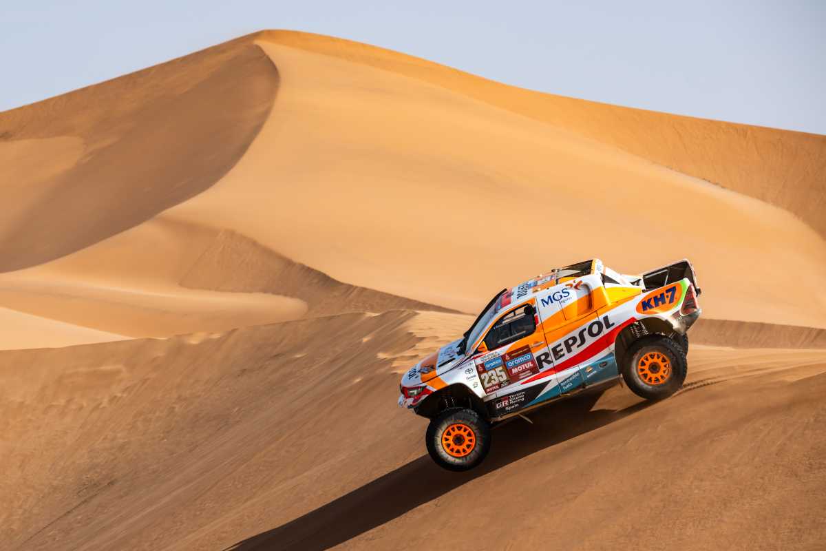 Etapa a etapa, ladrillo a ladrillo, el Repsol Toyota Rally Team está construyendo un Dakar 2024 para enmarcar. Únicamente hace falta una etapa limpia para que Isidre Esteve y Txema Villalobos cuajen un resultado parcial muy bueno. Este domingo, un pinchazo en la especial de 462 kilómetros, entre Al Henakiyah y Al Duwadimi, les ha costado un puñado de minutos, pero las sensaciones al volante del Toyota Hilux T1+ apoyado por Repsol, MGS Seguros, TOYOTA GAZOO Racing España y KH-7 son mejores a medida que pasan los kilómetros de competición.