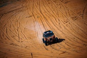 Este lunes el recorrido les ha dado un pequeño respiro, con una etapa más rápida, a la par que bonita, con pistas de arena y dunas en el primer tramo cronometrado y una zona mucho más incómoda, con mucha piedra en la parte final, después de una larga neutralización de 179 kilómetros.