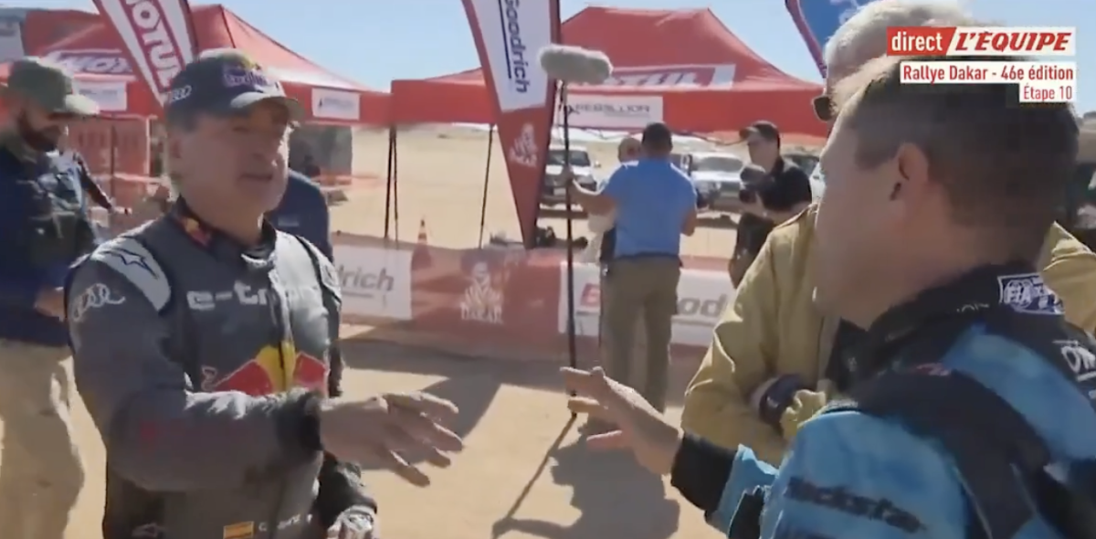 Carlos Sainz, MUY ENFADADO, le recrimina al copiloto de Romain Dumas que le haya estorbado en la etapa de hoy: «Os tengo mucho respeto, pero no entiendo por qué os habéis comportado así. Y ahora iré a la FIA y apelaré, porque ya es la segunda vez».