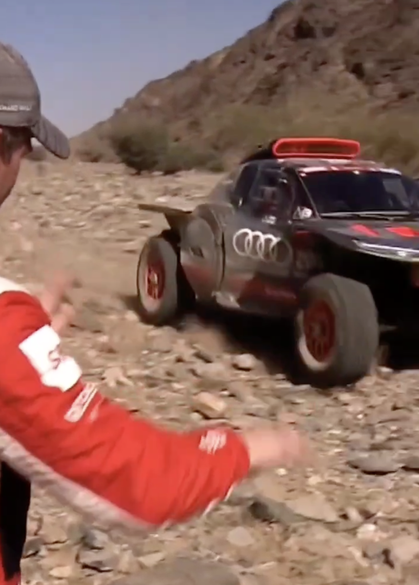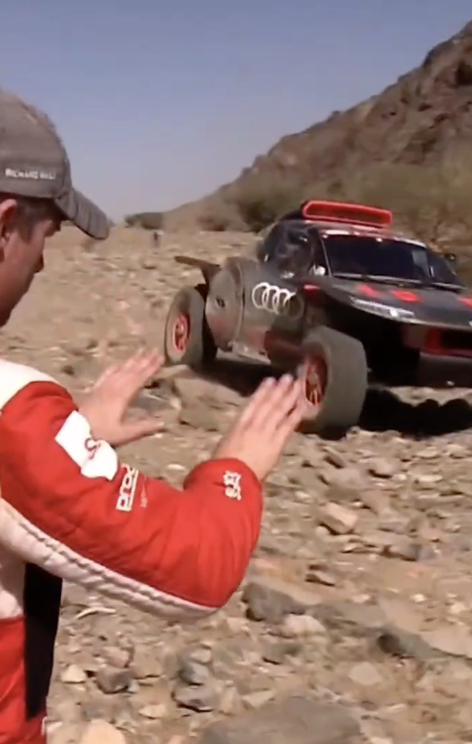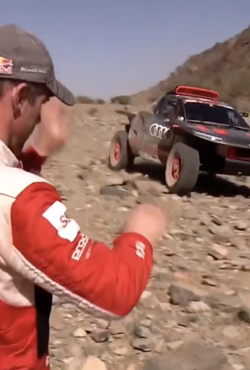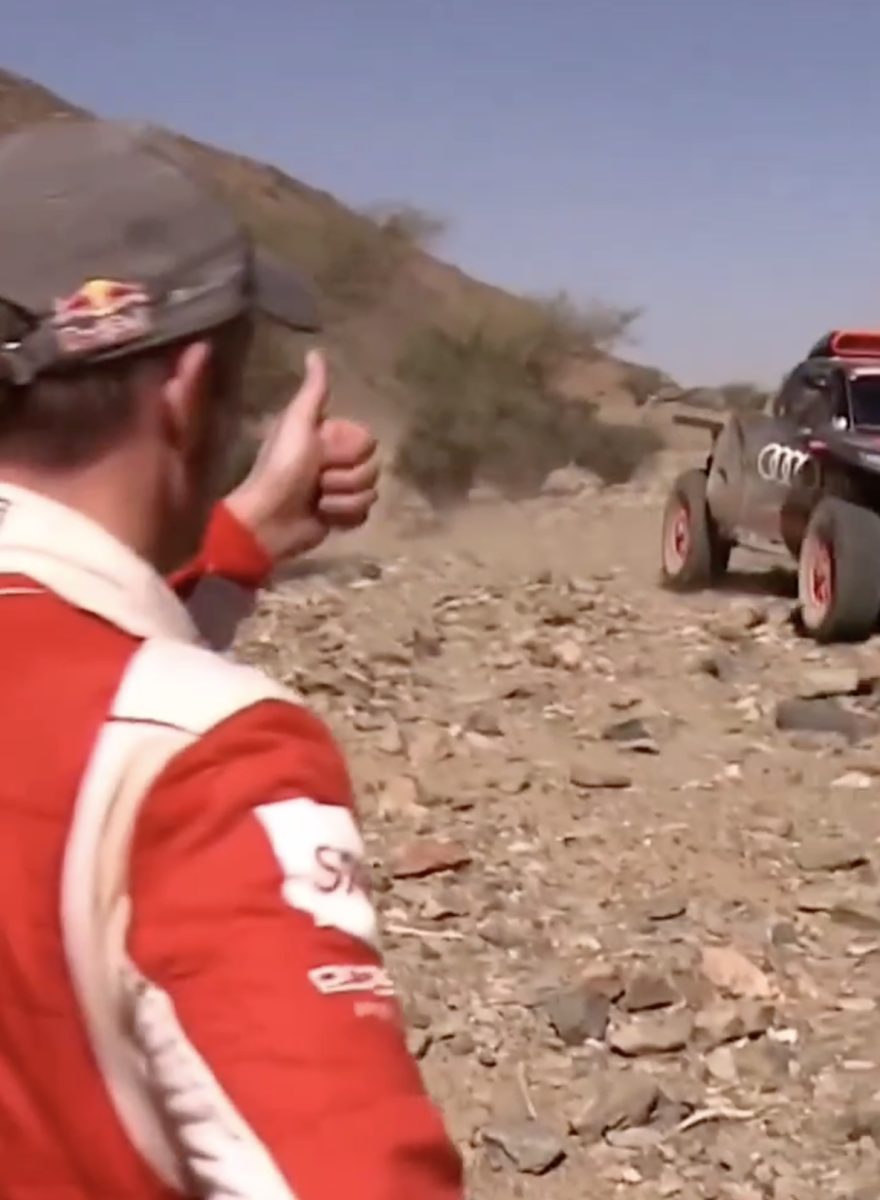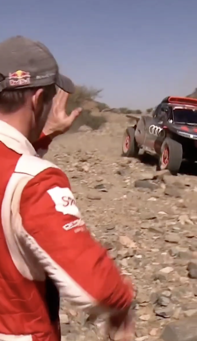 En un momento dado le tocó el turno a los líderes, los españoles Carlos Sainz y Lucas Cruz (Audi), que cuando estaban a la altura de Loeb éste les hace la señal de que están bien y que conduzcan con cuidado y de manera lenta porque el terreno está realmente complicado, algo que sufrió en sus propias carnes. Sin lugar a dudas, una de las imágenes del día, todo un gesto de deportividad y de caballerosidad de un rival hacia el otro en un momento en el que se estaban jugando el triunfo. ¡Grande Loeb!