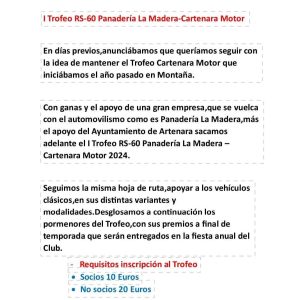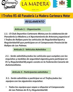 El Club Deportivo Cartenara Motor organiza, a partir de esta temporada 2024, el I Trofeo Regularidad Sport y Regularidad 60 ‘Panadería La Madera – Cartenara Motor’ en Montaña, que contará con premios en metálico para los tres primeros clasificados, los cuales serán entregados a final de temporada en la fiesta anual del Club.