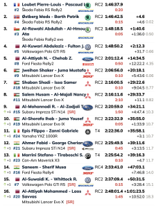 Loubet arrancaba el sábado con 22.7 sobre los noruegos Mads Østberg y Patrik Barth (Škoda Fabia RS Rally2), que habían marcado el mejor crono en seis de las siete especiales del viernes, por lo que se presumía batalla. En el primer tramo del sábado Al-Attiyah era el más rápido, seguido de Østberg, que le recortaba 4.4 a Loubet, que en la siguiente especial le metía 9.9 con el mejor crono, cerrando la mañana con un nuevo buen tiempo y ampliando la renta hasta 41.0 y pareciendo el rally sentenciado. Pero Østberg y Barth dieron todo y más, ganando las tres especiales finales, recordando mucho tiempo y quedándose a sólo 4.6 del triunfo, que una a parar a manos de Loubet y Pascaud en su primera visita a Qatar y en su primer rally con el Fabia RS Rally2.