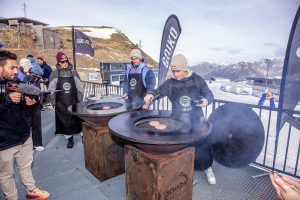 Los participantes en el evento, llegaron a las instalaciones del Port d’Envalira en autobús y se instalaron en el edificio VIP en donde, después de firmar el documento de exención de responsabilidades por las actividades que se llevarían a cabo, disfrutaron de un lunch, ofrecido por Hamburguesas GOICO, cocinado en la misma instalación. Cabe mencionar, que alguno de los deportistas se atrevió a ponerse el delantal y coger la paleta de cocinar para situarse al frente de los fogones.