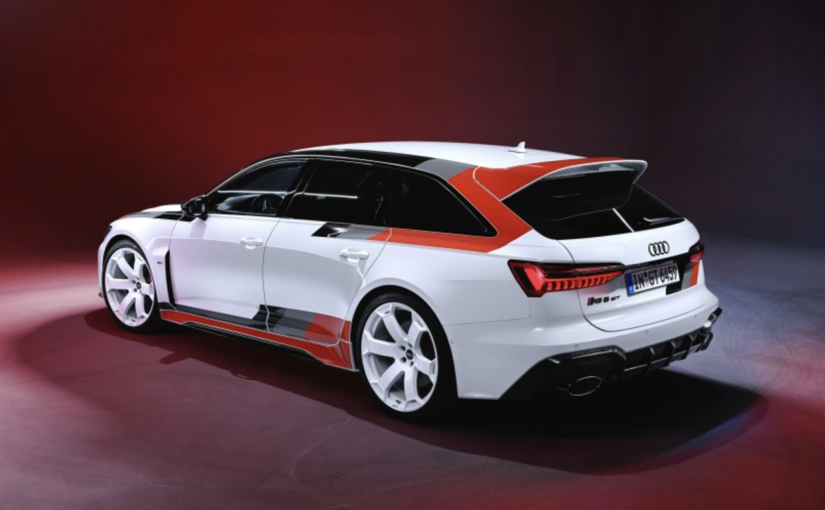El perfil lateral queda definido por las inserciones en los faldones laterales, las cubiertas de los retrovisores exteriores en carbono brillante y las llantas de 22 pulgadas en diseño de 6 radios fabricadas exclusivamente para el RS 6 Avant GT. En la parte trasera, la edición especial impresiona con la inscripción «RS 6 GT» en negro, un portón trasero especialmente adaptado al diseño con un borde de carga visualmente rebajado, un difusor funcional con un reflector centrado verticalmente que hace que el coche parezca aún más ancho y un característico alerón doble inspirado en el automovilismo. Por primera vez en la historia del RS 6 Avant, se han eliminado las barras del techo para conseguir una silueta aún más plana y deportiva.