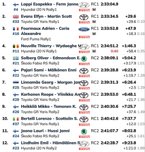 Quintos y primeros entre los Rally2 acabaron el sueco Oliver Solberg y el inglés Elliott Edmondson (Škoda Fabia RS Rally2), que en la jornada del viernes lograron la espectacular hazaña de ser terceros. El mayor empuje de los Rally1 le hicieron perder dos puestos, que su gran rally queda en la retina de todos. Sobresalientes.