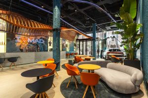 El diseño del espacio combina la sofisticación mediterránea con la esencia del Madrid más ‘canalla’. Destaca la presencia del granito de Madrid en varios espacios y elementos del City Garage, un material de gran valor patrimonial de la ciudad. En la primera planta se encuentran dos obras de arte que reflejan el espíritu de CUPRA: una escultura de color cobre en forma de ola y un mural del artista Chris Princic (&thankyou). Además, el mural contiene distintas referencias a Madrid: la fuente de Cibeles, la estatua ecuestre de Carlos III de la Puerta del Sol, varias retículas de la morfología urbana e, incluso, un gato en homenaje a los madrileños de más de tres generaciones.
