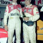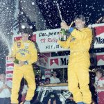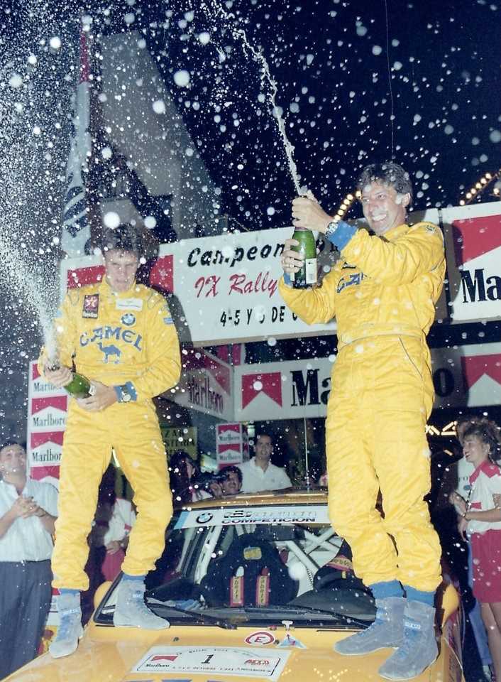 Toma y daca de dos equipos canarios hasta la conclusión del IX Rallye Villa de Adeje (Tenerife, 1991). En las imágenes de José Manuel Nuez, los dos primeros de la General clasificados por una diferencia de 18 segundos. Exultantes los vencedores de la prueba -a la vista está-, José Mª Ponce y J. C. Déniz, sobre el BMW M3 (Nº 1) de Sauermann Competición.