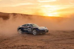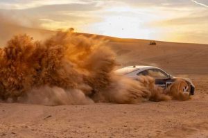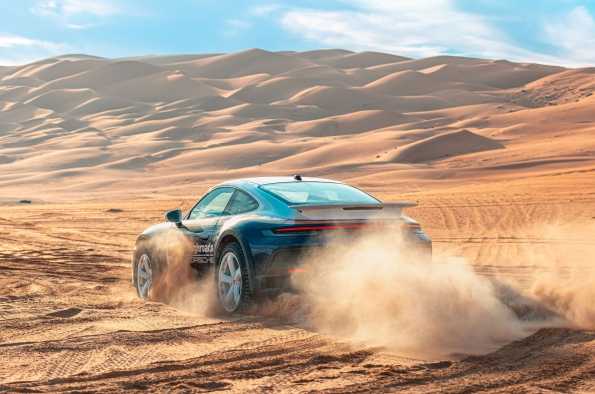 Con su decoración “Roughroads”, el 911 Dakar llama la atención por las calles de Abu Dabi, donde el viaje de Al Qubaisi comienza al amanecer. Liwa se encuentra a unos 220 kilómetros al sur de la ciudad, y se llega a través de rápidas carreteras pavimentadas para, poco después, adentrarse en terrenos más complicados.