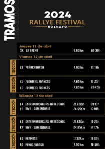 El tramo más largo será el E5 y E7, Riva-San Antonio con 2 pasadas y un total de 24.65 km en cada pasada. Por su parte el tramo más corto pero no menos especial es la subida a Peñacabarga con 4.9 km que servirá como primer y último tramo del Rallye Festiva Hoznayo 2024.