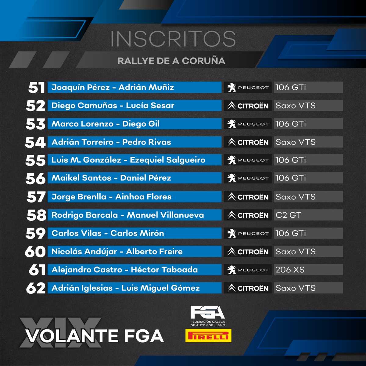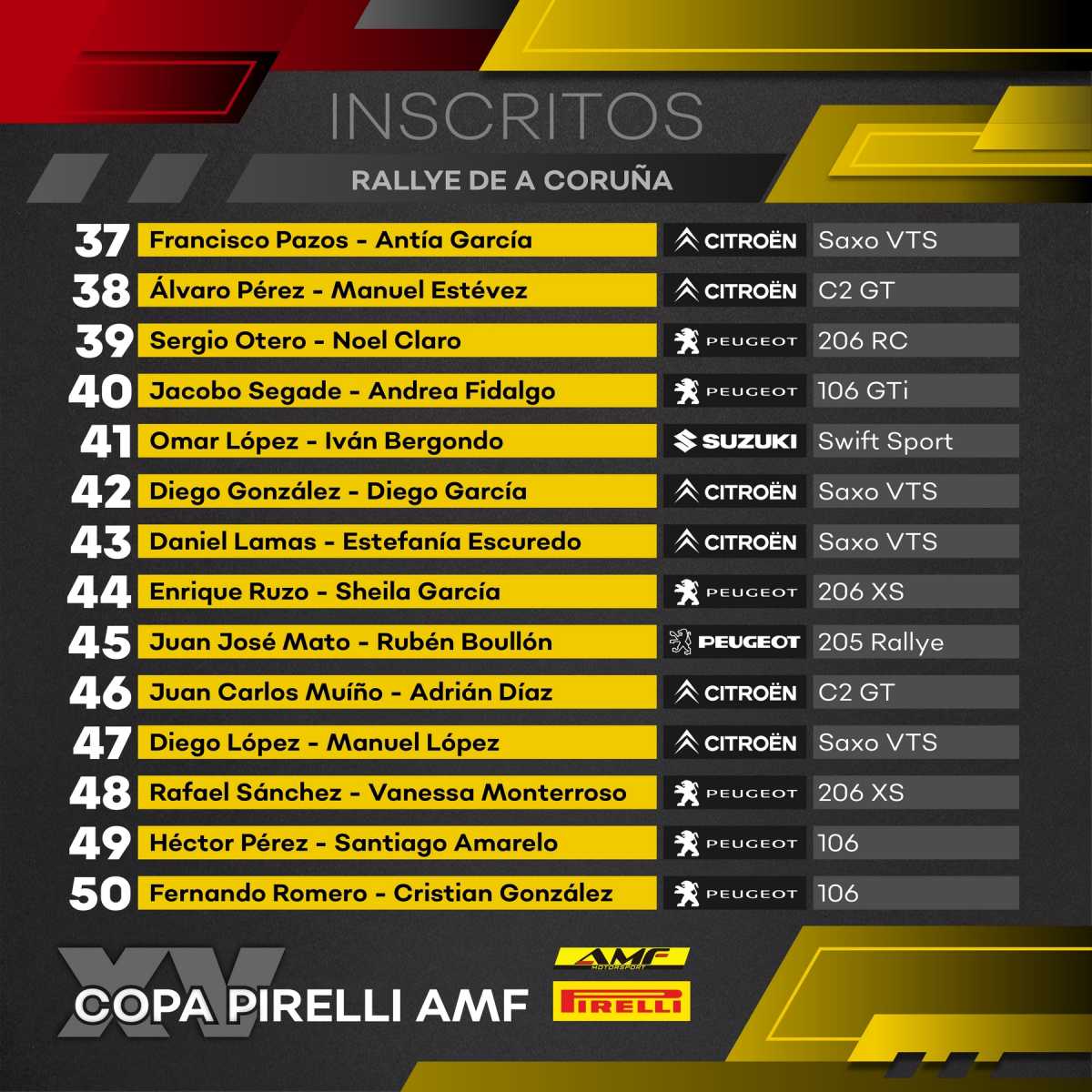 La Copa Pirelli AMF tendrá a Álvaro Pérez como principal favorito, si bien Jacobo Segade, Fran Pazos o Sergio Otero le pueden poner las cosas difíciles en una temporada que promete ser emocionante. Diego González está de regreso en esta copa después de varias temporadas en el Volante FGA a los mandos de su Citroën Saxo.